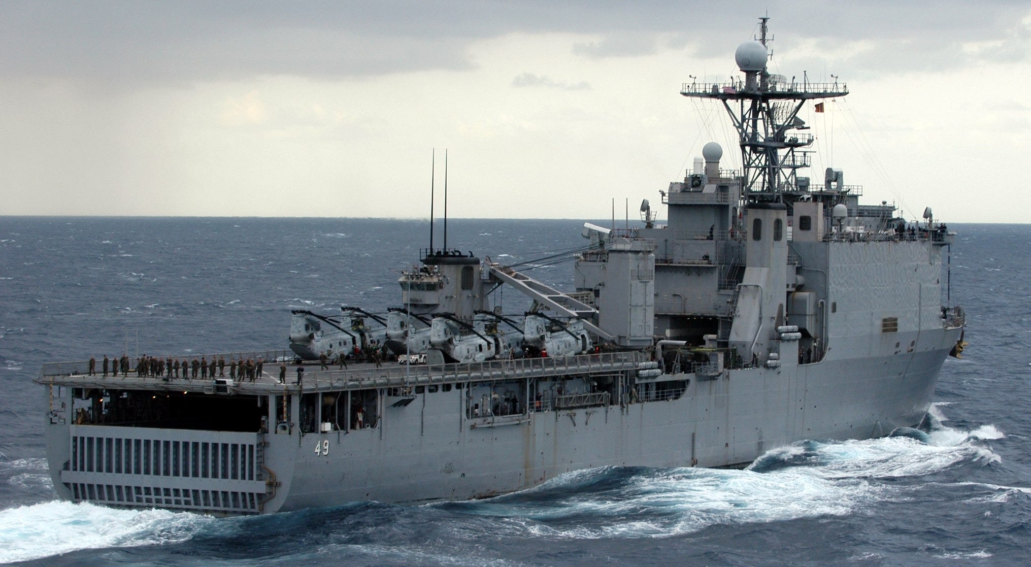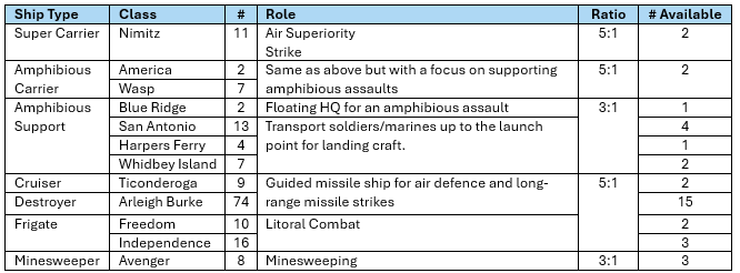 The 5:1 ratio only applies to the types of vessels that are usually kept on station, such as carriers, escorts and fleet sustainment ships. Amphibious support ships and other specialized vessels can use a 3:1 ratio. Therefore the following ships would potentially be available for a forcing of the Straits of Hormuz:
