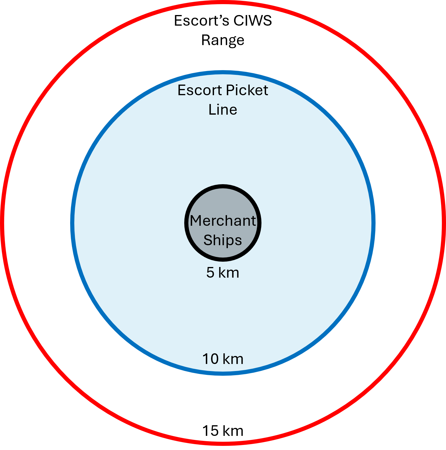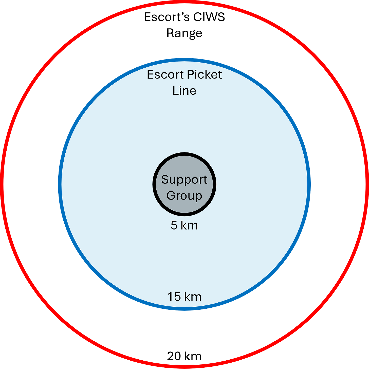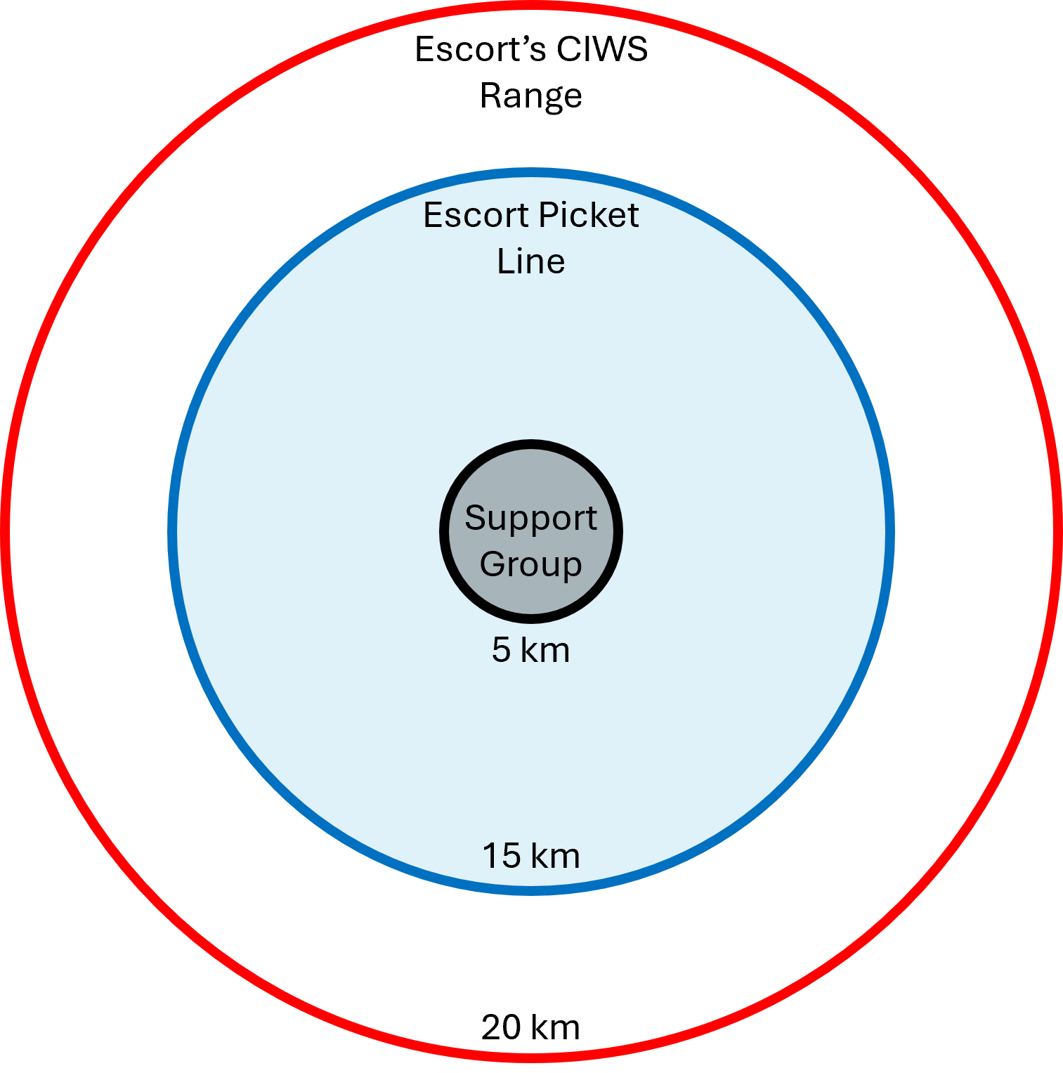 The Support Group would sail in a roughly circular convoy with a diameter of about 5 km. Most of the escorts would form a picket line with a diameter of up to 15 km. Various CWIS systems have an engagement range of approximately 5 km, so the entire task force would be able to engage ASMs and drones with CWIS across a circular area with a 20 km diameter.