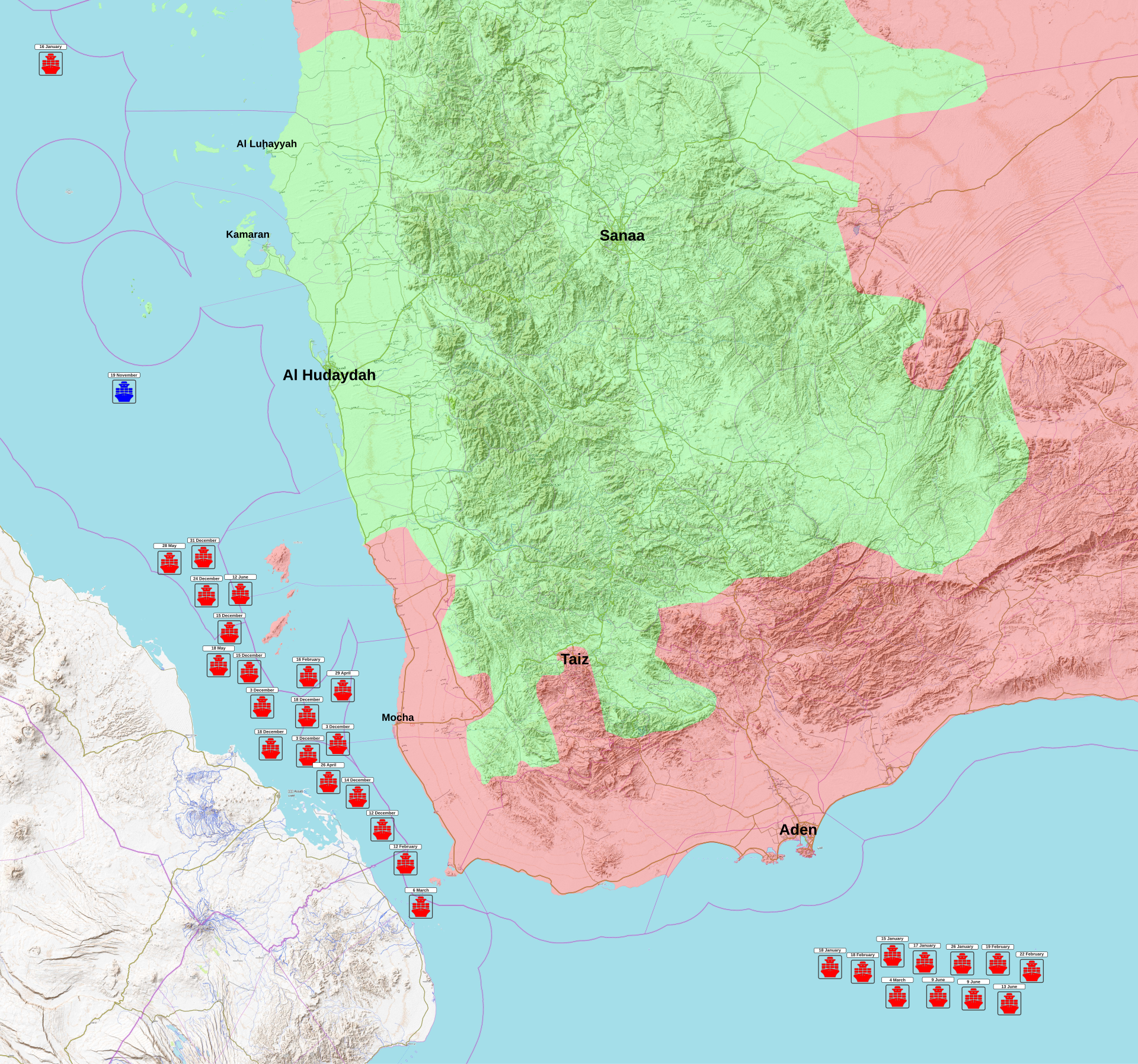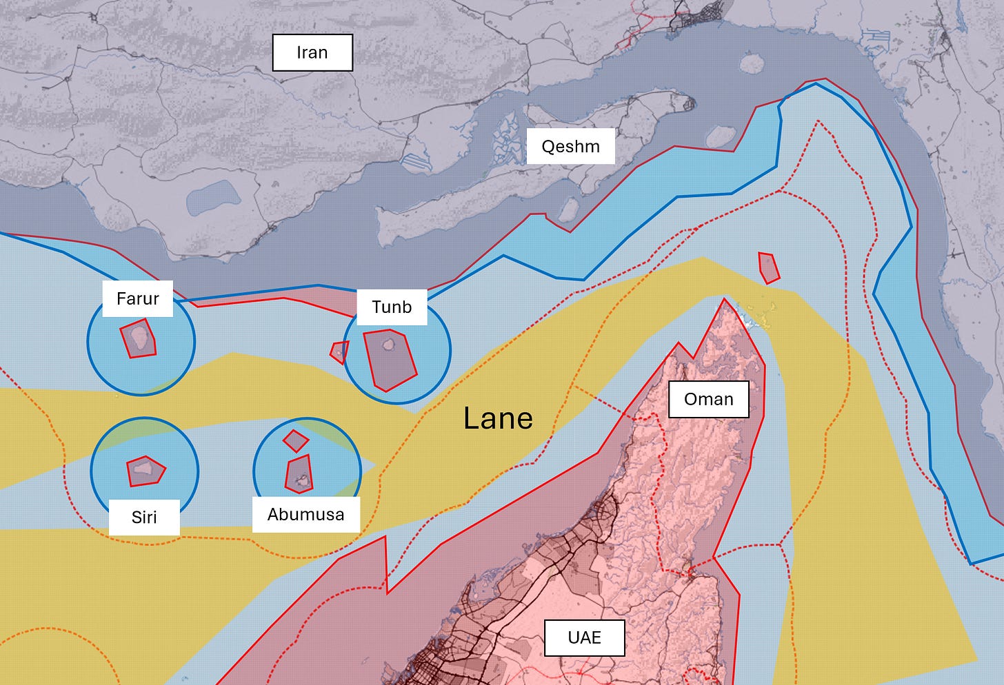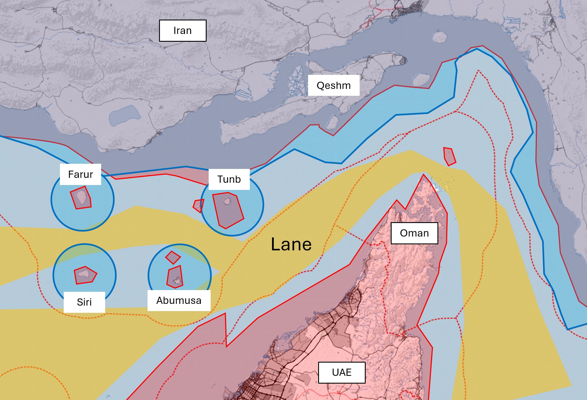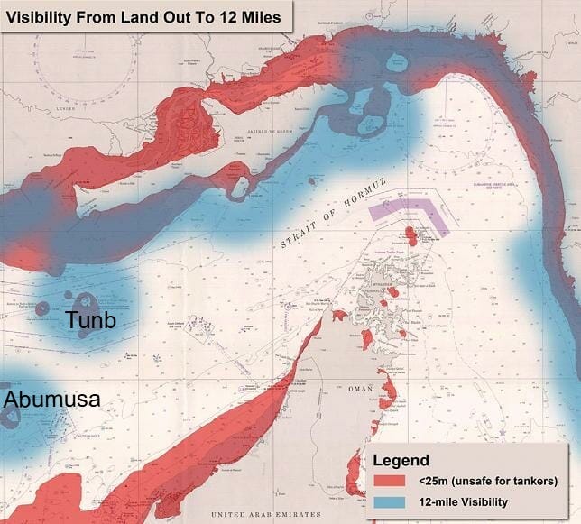 The blue shaded area is in visual range of Iranian controlled territory. These areas should be avoided, but can be navigated at increased risk; and