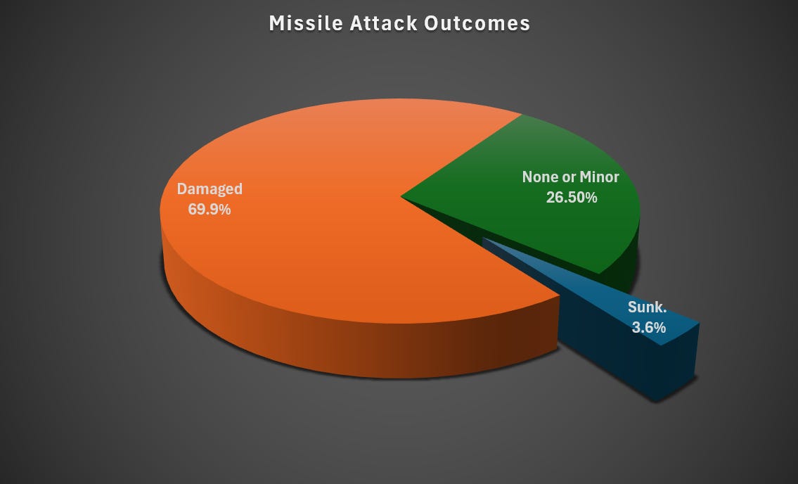 However, the missile and small boat attacks were very effective at damaging merchant ships, with a success rate of 69.9%. The given merchant ships are crewed by civilians, operated by corporations and need obtain insurance for each voyage, creating a significant rick of damaging the ship is often enough to shut down a shipping route.