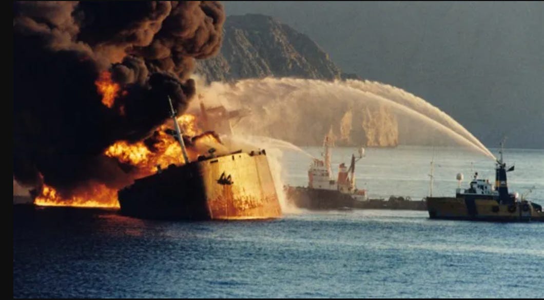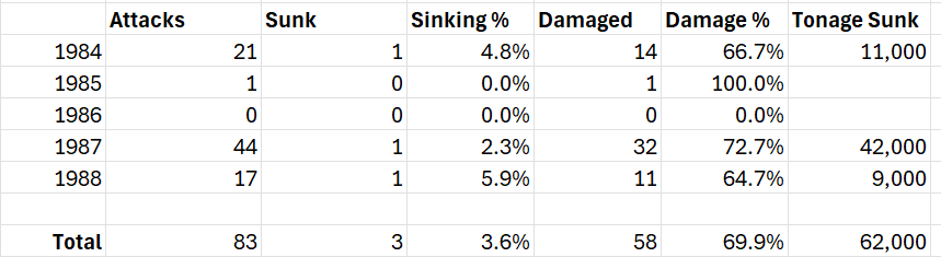 Only 3.6% of these attacks successfully sunk a merchant vessel. Of these three sunk merchant vessels only one, an oil tanker called the Norman Atlantic, was a large ship at 42,000 tons. She was sunk by Iranian Revolutionary Guard members in small motorboats.