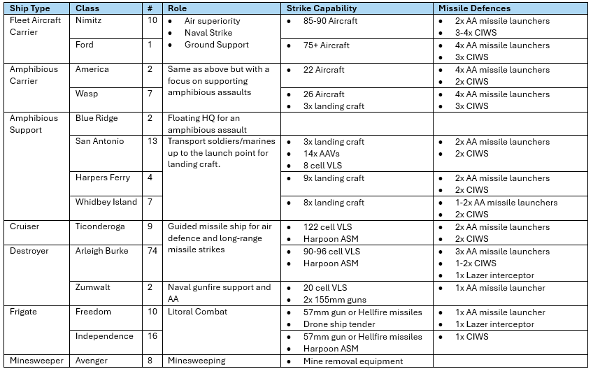 The table below shows the portions of USN’s surface warship fleet that could be used in the Straits of Hormuz, along with their key capabilities: