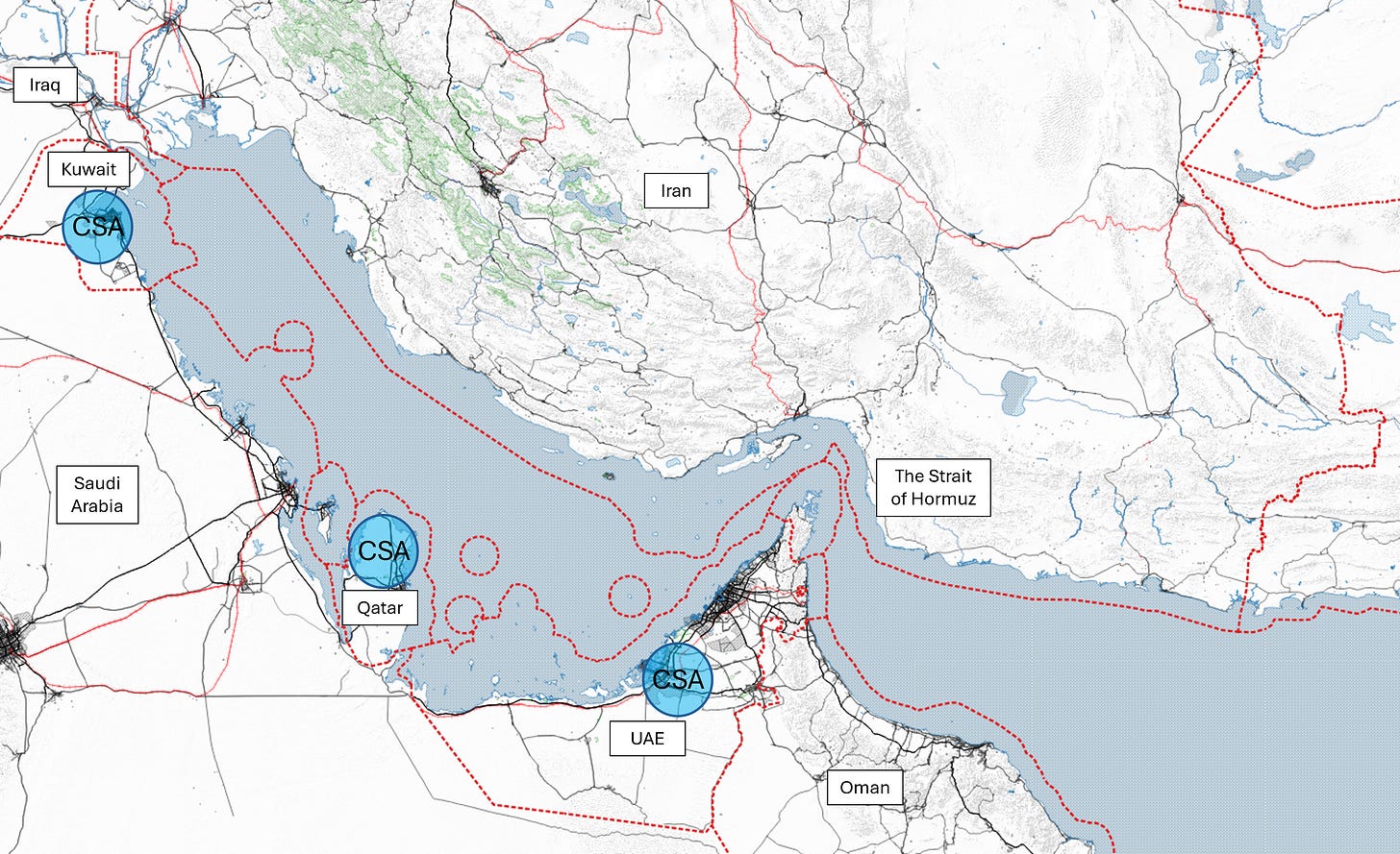 To keep an invasion via Iraq or the Persian Gulf supplied requires a flow of merchant shipping to pass through the Straits of Hormuz. Initially these would be to supply the Corps Service Areas (CSAs) that would be located near one of the ports in Kuwait, Qatar and/or the UAE.