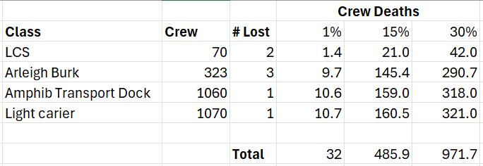 Under this worst case scenario the USN is likely to lose 3-5 escorts and 1-2 of the larger vessels, like the light carriers or amphibious transport docks. Historically when a warship is sunk the crew suffers a 1-30% fatality rate. Applying this range to the ships involved to the worst case scenario could have almost a thousand American fatalities.