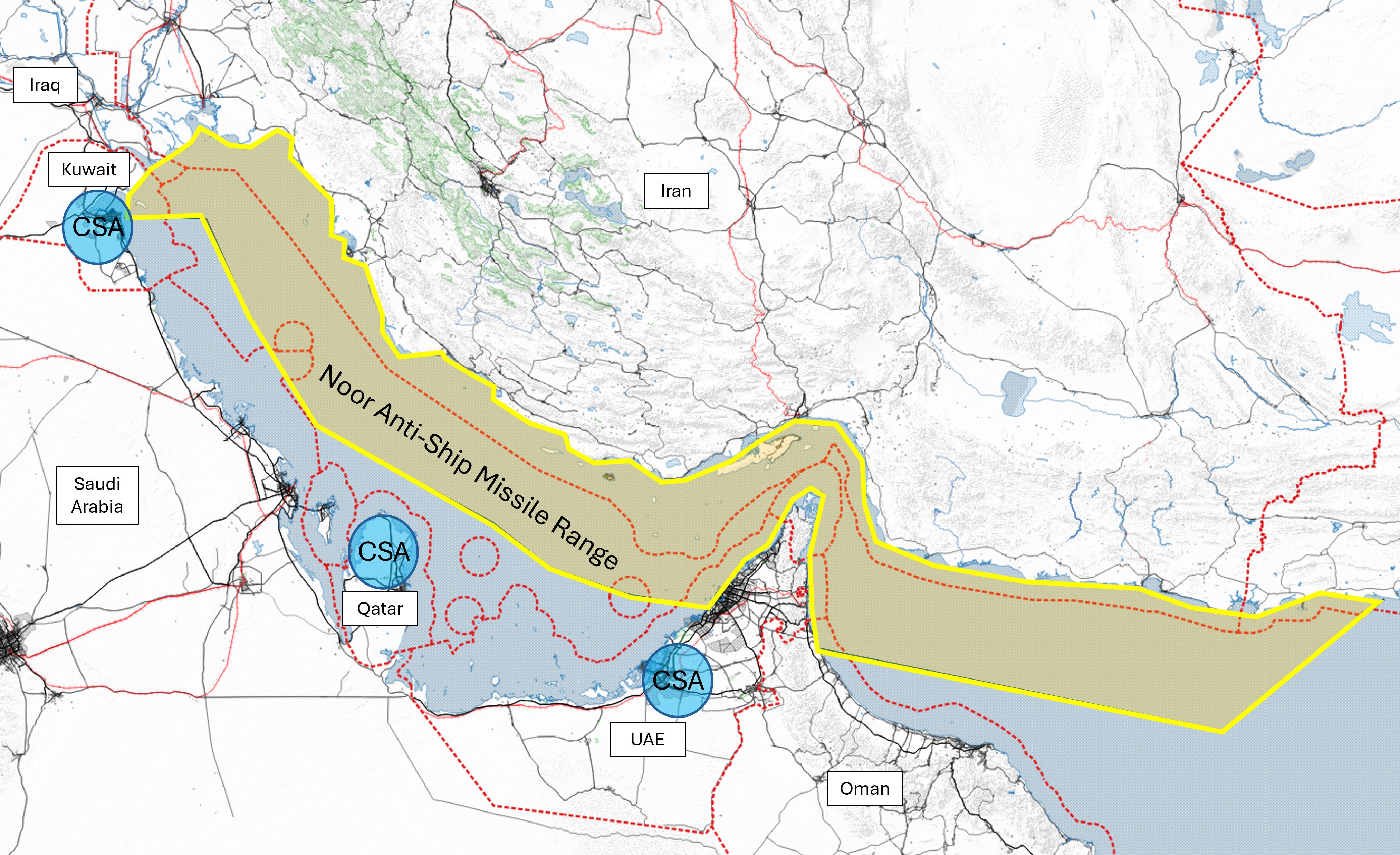The most numerous of Iran’s short range ASM systems is called the Noor. In the map below I have shown the range of the Noor in yellow, as this is a good yardstick for where Iran can launch a swarm of cheap short range ASMs and drones.